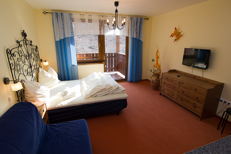 Apartmán 507- studio pro 2 - 4 osoby – má dvě pevná lůžka a dvě přistýlky. Najdete zde zařízený kuchyňský kout,ledničku,vařič, varnou konvici,mikrovlnku. LCD televizi se satelitním příjmem, bezplatné připojení k internetu.K apartmánu přísluší uzamykatelná kóje pro úschovu lyžařského vybavení, lyžáků, kol .Apartmán má balkón s posezením.